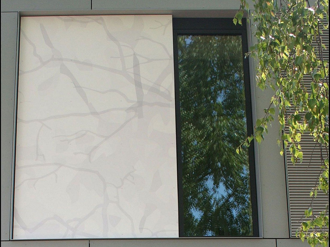 Unsere Leistungen: Fenster- und Fassadenarbeiten in Holz-Aluminium, Vorhangfassade in Eternit mit Dämmung, sowie Senkrechtmarkisen